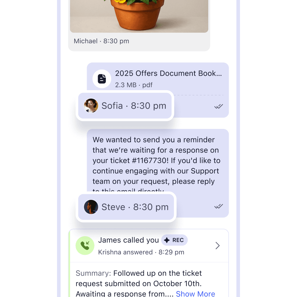 Handle calls, texts, voicemail, and tickets in one shared inbox—so you always have the full context.