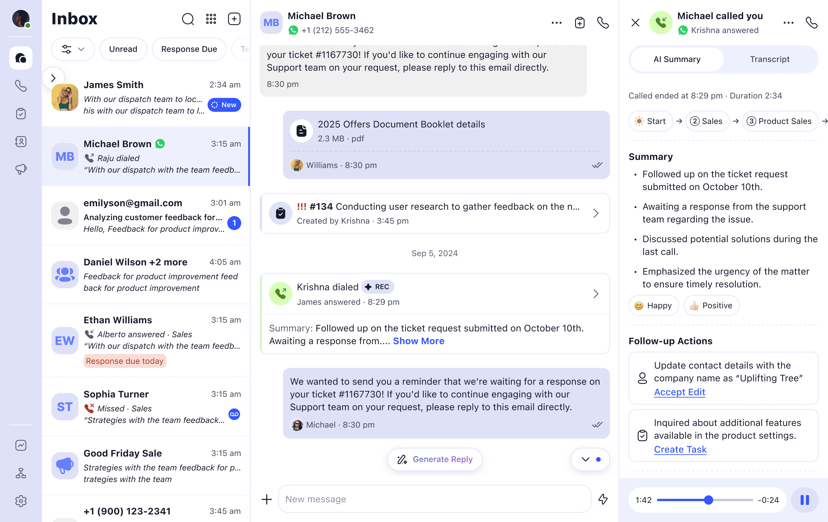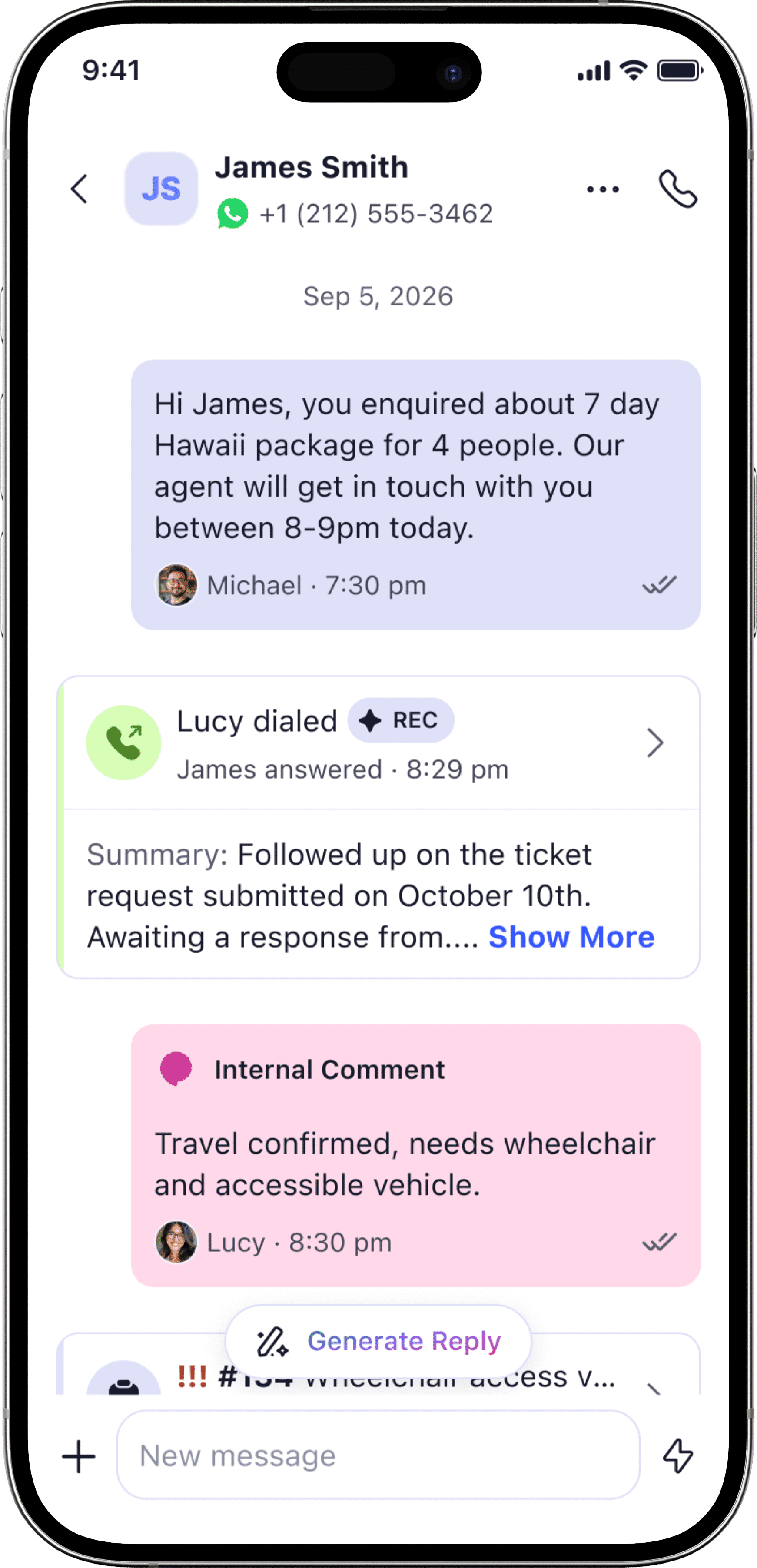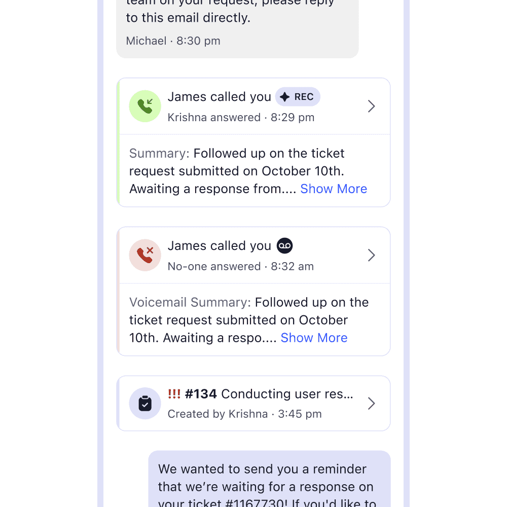 Timeline of text messages, calls, voicemail, and tickets in one feed.